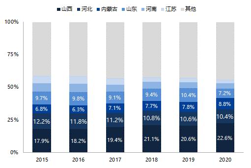 从长周期来看,山西及内蒙古因原料获取便利的优势,焦炭产量呈现逐年增长的趋势,而河北、山东及江苏的产量占比则不断压缩。近年来,河北所在的京津冀地区实施“以钢定焦”,通过下游炼钢产能的压减倒逼落后焦化产能的退出,而山东推行“以煤定产”,借助上游煤矿过剩产能的关停推进全省焦化产能的缩减,江苏则从2018年始开启环太湖高污染产业整治计划,2019年又将高污染排放的焦化行业治理范围扩展至苏北的徐州地区。综合来看,焦化行业在全行业改革升级的过程中产能更加集中化和大型化,山西作为焦化大省的地位日益稳固。