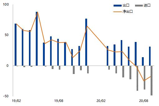 分析焦炭进出口情况的转变亦能验证如上观点。2020年7月之前,我国在国际焦炭贸易中一直处于净出口国的角色,而7月焦炭进口量首次大于出口量,8月及9月则延续了净进口量增长的事实,我国因此转变为焦炭净进口国,进口来源地多分布在亚太国家,如日本、韩国等地。究其原因,除了全球疫情影响下海外高炉利用率大幅下滑导致国际主要焦炭消费地刚需不足之外,国内焦炭供应紧张也助力焦炭贸易流向的反转,沿海大型钢厂通过较低的海运费用即可采购海外优质焦炭,从而弥补焦炭内调紧张的局面,但进口量尚处低位,净进口量对国内供需情况的补充相对而言暂有不足。