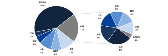 国内焦炭近22%的产量来自于山西,其余依次为河北、内蒙古、山东和河南等省,前五省合计占比达到54%,超半数的产量占比使得五省的产能增减情况对全国焦炭供应的影响不容小觑,而山西又因为稳坐焦炭产能产量第一大省的地位而历来在焦炭市场拥有举足轻重的地位。纵观山西全省,焦炭产能多分布于南部及中部地市,即吕梁、临汾、长治、运城、晋中和太原,各地焦炭产能的变化也将深远地影响全国焦炭供给情况。