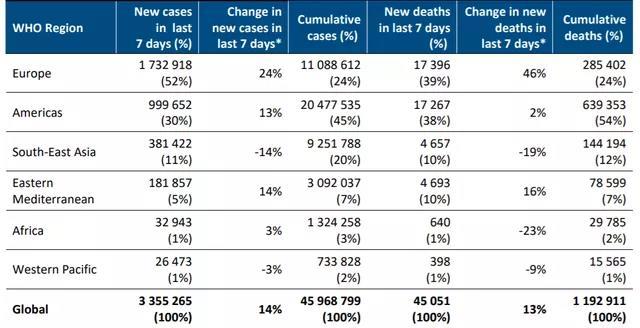 欧洲累计确诊新冠肺炎病例已经超过了1100万例,死亡超28万人,在上周全球新增3355265例新冠肺炎确诊病例中,欧洲区域新增病例超过173万例,占全球新增病例的一半以上。