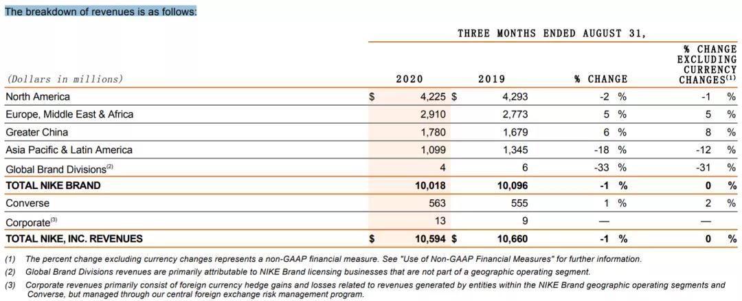 受疫情影响,耐克的业绩曾出现严重下滑。从数据上来看,其2020财年第四财季实现营收63.13亿美元,同比下降38.14%;净利润亏损7.9亿美元,同比下滑179.88%。其中,北美营收同比下降41%,欧洲、中东和非洲下降46%,亚太和拉美下降42%。仅大中华区表现稳健,营收仅下降3%。