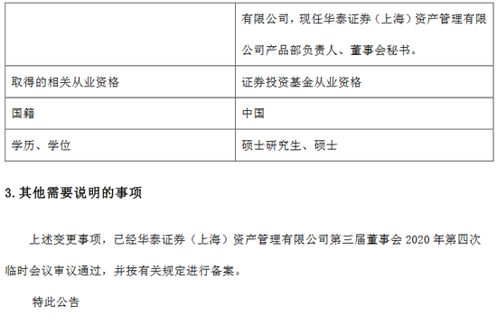 11月5日,华泰证券(上海)资产管理有限公司发布高级管理人员变更公告,新任刘博文为董事会秘书,任职日期2020年10月27日。