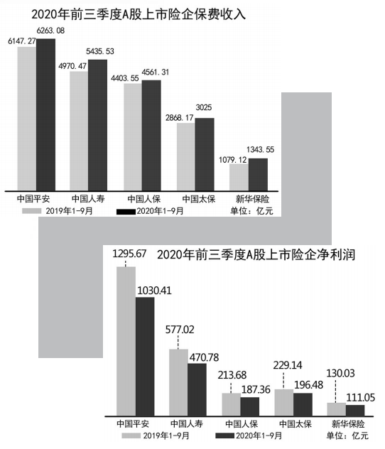 从保费规模看,五大险企前三季度保费收入合计2.06万亿元,同比增长5.8%。中国平安保费收入为6263.08亿元,居五大险企之首,同比增长1.88%。新华保险保费收入增速最快,前三季度保费收入1343.55亿元,同比增长24.5%。