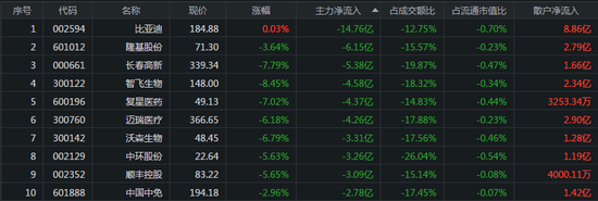 从个股来看,比亚迪、隆基股份、长春高新分别遭主力资金卖出14.76亿元、6.15亿元、5.38亿元。