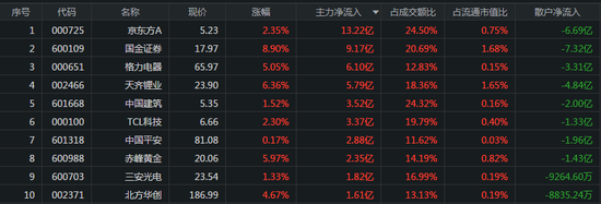 从个股来看,主力资金最青睐的3只股票分别是京东方A、国金证券、格力电器,流入金额分别为13.22亿元、9.17亿元、6.10亿元,所对应的涨幅分别为2.35%、8.90%、5.05%。
