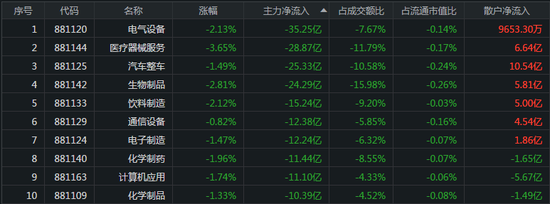 主力资金流出的板块分别是电气设备、医疗器械服务、汽车整车,主力资金流出金额分别为35.25亿元、28.87亿元、25.33亿元,其中散户净流入金额为9653.30万元、6.64亿元、10.54亿元。