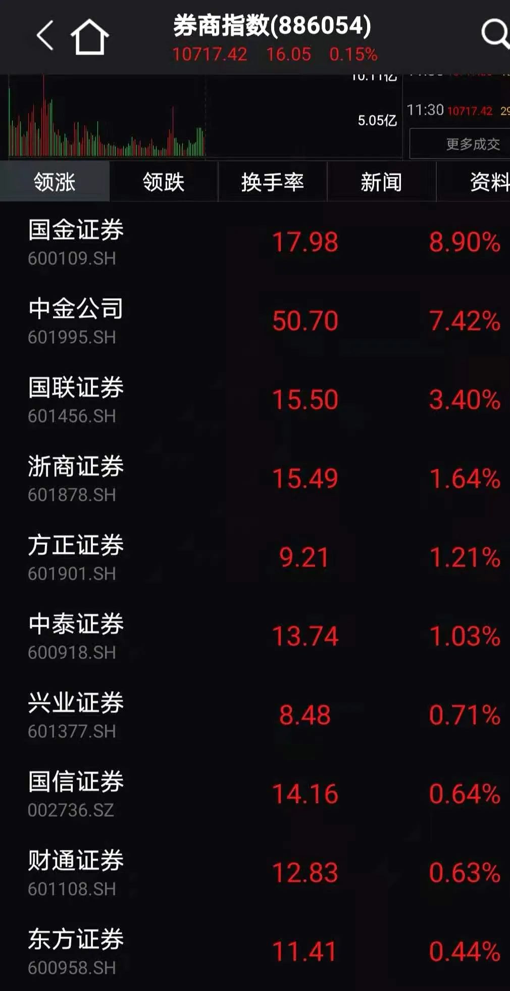 券商股逆市表现活跃,截至午间收盘,券商指数上涨0.15%,板块内国金证券一度涨停,至收盘上涨8.9%,国联证券上涨3.4%,浙商证券、方正证券等涨超1%。