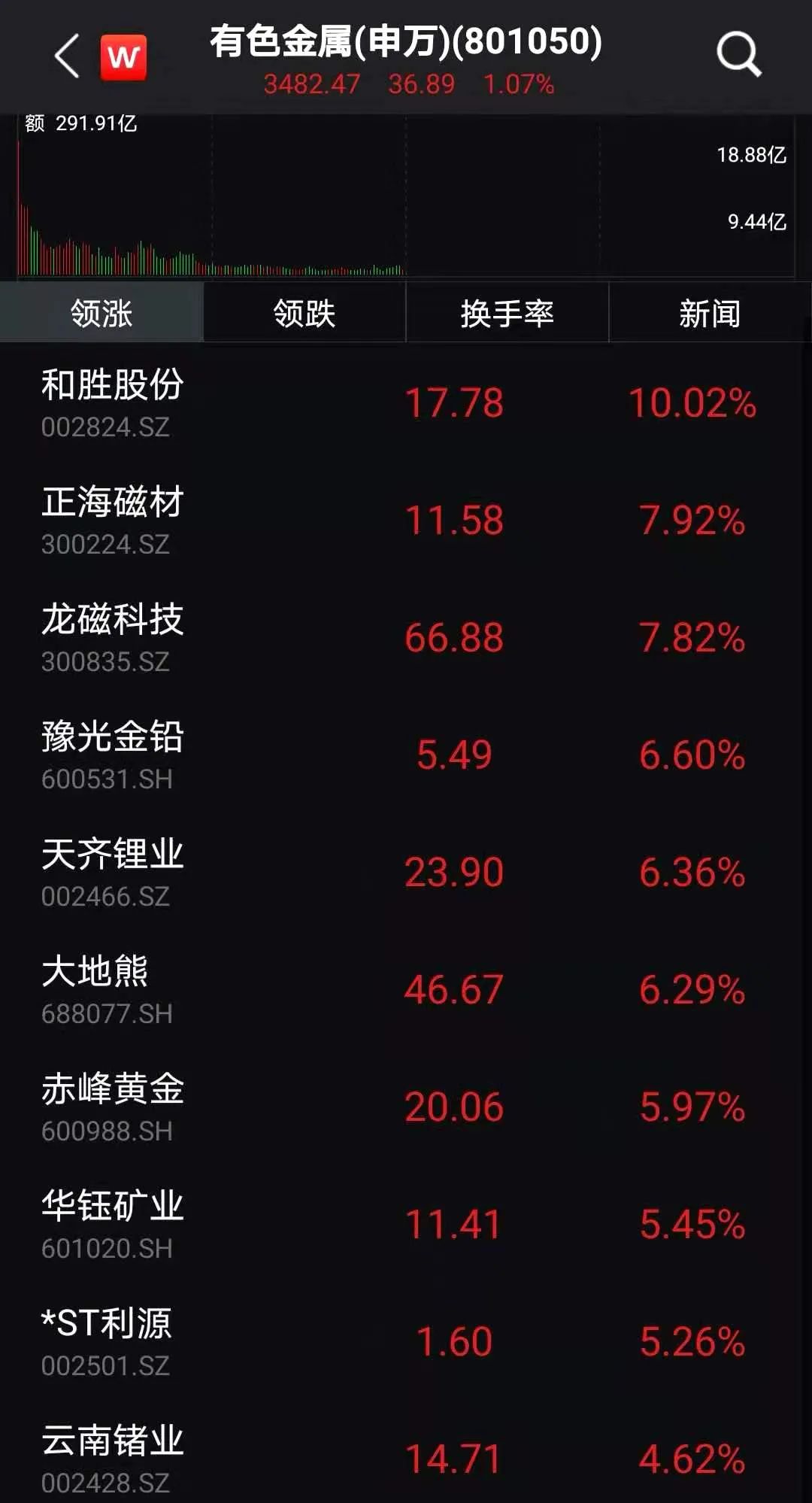 来源:Wind有色金属板块也表现活跃,钢铁、采掘等板块紧随其后,和胜股份涨停,龙磁科技、正海磁材、大地熊等多股涨幅超过6%。