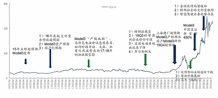 时间线拉回到03年,03年特斯拉成立,08发布了第一款两门运动型跑车Roadster,但是一路摸索直到15年model3发布业绩才稍有起色,在经过漫长的认知塑造期,直到19年才进入盈利+产销旺双重利好,到了20年由于疫情全球交付量激增。