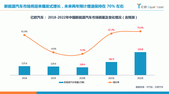 此前亿欧汽车预计2020年中国新能源汽车销量为109.4万辆,同比增速-9.3%。从国家政策指导,市场供需情况来判断,亿欧汽车认为未来两年中国新能源汽车市场的增速将保持在70%左右;随着新能源汽车市场份额逐年提升,预计2022年中国新能源汽车销量占整个汽车销量比值将超过10%。