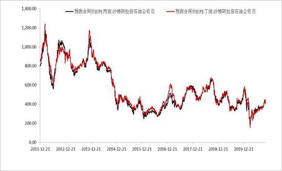 LPG的来源主要由三种途径,分别是从炼厂石油气中获取、从油田伴生气中获取、从天然气中获取。其中,油田伴生LPG主要由丙烷(C3H8)、丁烷(C4H10)组成。而炼厂生产的LPG组分相对复杂,除包含丙烷、丁烷外,还含有丙烯、丁烯(正-异-反-顺等异构体)等多种组分,是一种混合物。国际LPG定价主要围绕全球LPG的主要供需区域产生,主要定价方式参考北美MB、沙特CP以及日韩FE,其中沙特CP价(FOB价)是沙特阿美基于前一个月月初、月中、月底3次招标的中标价,并参考现货价格趋势而制定的价格,于每月底对外正式公布下一个月的CP。我国LPG原料进口依赖度较高,从丙烷进口的来源国看,我国丙烷进口主要来源于中东的几个产油大国,阿联酋、卡塔尔、科威特和沙特阿拉伯,因此月初的CP报价具备一定的参考性。“涨价看进口”,沙特最新公布的11月CP价格较10月水平有大幅上涨,其中丙烷来到430美元/吨,较10月上调55美元/吨;而丁烷价格为440美元/吨,较10月上调60美元/吨,对期现价格形成有力支撑。