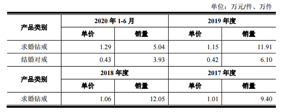 报告期内,公司求婚钻戒销量分别为9.40万件、12.05万件、11.91万件和5.04万件,结婚对戒销量分别为3.87万件、4.79万件、6.1万件和3.93万件。
