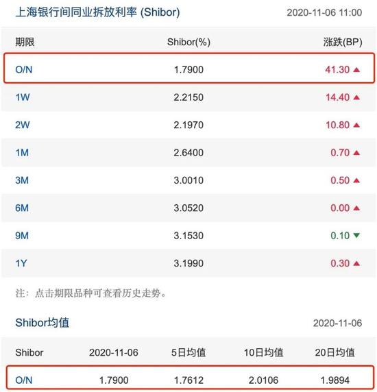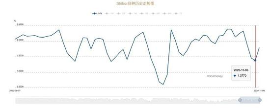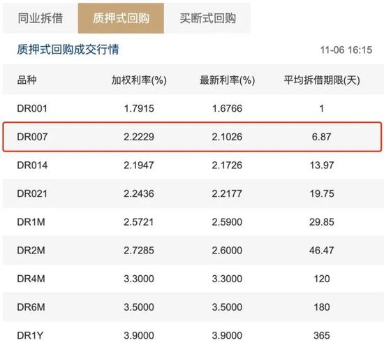 从资金价格来看,经过连续逆回购操作后,短端资金利率已明显下行。据全国银行间同业拆借中心数据显示,10月15日,隔夜Shibor报2.063%;月底流动性偏紧,10月27日隔夜Shibor升值2.38%的月内最高点;11月5日,隔夜Shibor下行至1.337%,流动性紧张明显缓解;11月6日,虽然隔夜Shibor上行41.3个基点至1.79%,但仍维持较低水平,低于10日均值2.0106%。截至11月6日16时15分,衡量流动性水平的市场关键指标之一DR007的加权利率为2.2229%,低于10日均值2.3215%。
