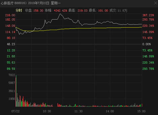 作为在2019年7月22日首批上市交易的25只科创板个股之一,心脉医疗的发行价为46.23元/股,对应发行募集资金净额7.29亿元。上市当日,心脉医疗开盘股价涨207%,盘中最高涨幅高达367%,收盘涨幅242%,报158.30元/股。