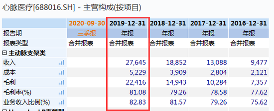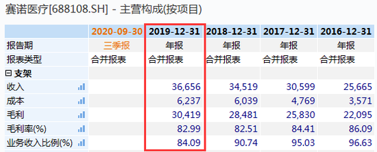据Wind数据,心脉医疗2019年年报显示,公司的主动脉支架类产品占公司业务收入比例高达83%,毛利率也高达81%。同样的,赛诺医疗的2019年年报也显示,公司的冠脉支架产品的收入占比也达到了84%,毛利率更是达到83%。