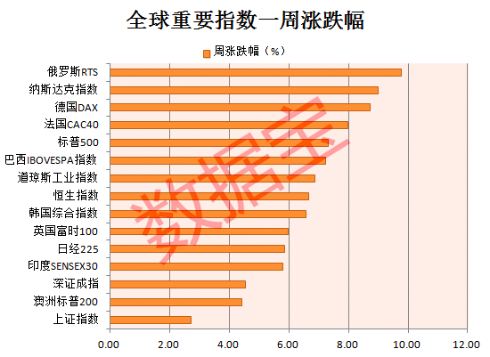 在美股的反弹情绪带领下,全球股市大涨。从全球重要股市指数一周表现看,俄罗斯RTS指数涨幅居前,累计上涨9.76%,纳斯达克指数、德国DAX、法国CAC40等多个指数涨幅超7%。