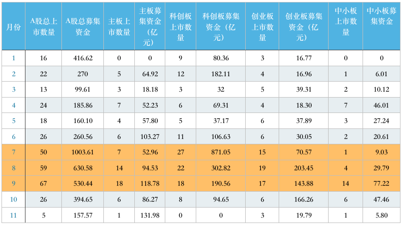 从A股市场今年每月新股上市的数量来看,1月~6月,每月上市的公司数量在13家~26家(含)之间;进入7月份,上市数量骤增,并在之后的8月和9月逐月增加,这三个月上市的公司数量分别为50家、59家、67家,融资额也相应放大,分别为1003.61亿元、630.58亿元、530.44亿元;但到了10月份,上市数量又大降至26家;截至11月8日,当月有5家公司上市。
