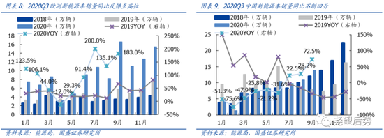 新能源汽车在疫情缓和之后,两大主要销售地区中国和欧洲均出现需求拐点,国内新能源车9月单月销量回升至13.8万辆,同比增速达到72.5%,欧洲新能源车9月单月销量回升至16.6万辆,同比增速达到183.0%,后续有望维持高增长。