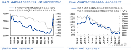 化工下游产品众多,广泛应用于建筑、电子、家电、农业、纸质包装、汽车、医疗、能源、食品等各行各业,前期疫情的影响,大部分行业都存在需求上的冲击,但疫情缓和之后,需求则大幅反弹。后续随着国内经济的修复,继续看好产品格局好,具备成长性同时业绩弹性大的细分板块,包括聚氨酯(下游需求修复以及装置检修密集期导致供给收缩,MDI持续上行)、化纤(国内纺服需求改善,对外出口订单也增加,推动化纤价格反弹)以及钛白粉(下游需求修复以及及进口钛矿供应收紧带动价格回升)等。