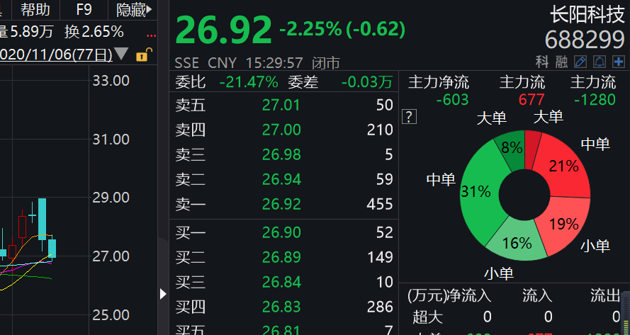 截至11月6日收盘,长阳科技报26.92元,总市值76亿。从上市首日至今,股价累计涨幅为51.79%。