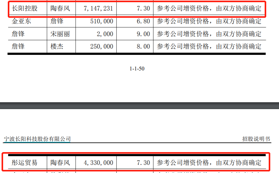 记者梳理招股书发现,2017年7月,长阳科技增资,股票发行价格为每股6.80元,募集资金总额不超过2.48亿元。同年8月-12月,公司股东金亚东、长阳控股、彤运贸易等通过全国中小企业股份转让系统,自愿协议转让了部分股份。陶春风以7.3元/股的价格,从长阳控股、彤运贸易分别受让了714.7231万股、433万股,斥资8378.38万元。