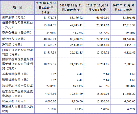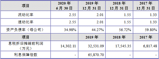 2017年至2020年上半年,同行业可比上市公司资产负债率平均值分别为35.85%、39.20%、39.13%和35.25%;流动比率平均值分别为2.87、2.51、2.42和2.95;速动比率平均值分别为2.80、2.41、2.30和2.91。