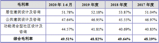 尤安设计主营业务毛利来源于居住建筑设计及咨询业务、公共建筑设计及咨询业务及功能混合型社区设计及咨询业务。2017年至2020年1-6月,居住建筑设计及咨询业务毛利分别为1.37亿元、2.29亿元、2.39亿元和1.18亿元,占营业毛利的比例分别为58.44%、63.18%、57.25%和58.56%;公共建筑设计及咨询毛利分别为6432.24万元、8757.76万元、1.13亿元和5679.73万元,占营业毛利的比例分别为27.44%、24.18%、27.20%和28.14%;功能混合型社区设计及咨询业务毛利分别为3310.40万元、4576.92万元、6483.24万元和2683.95万元,占营业毛利的比例分别为14.12%、12.64%、15.55%和13.30%。