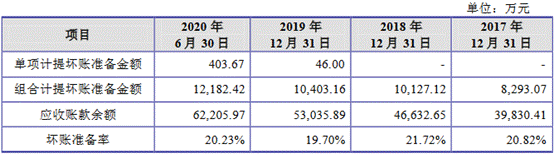 报告期内,应收账款坏账准备分别为8293.07万元、1.01亿元、1.04亿元和1.26亿元,坏账准备率分别为20.82%、21.72%、19.70%和20.23%。同期,同行业可比上市公司应收账款坏账准备率平均值分别为16.76%、17.34%、18.25%和18.26%。