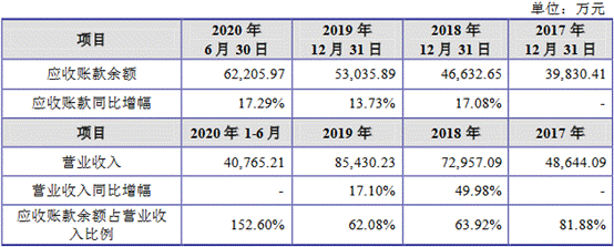 2018年、2019年和2020年上半年,尤安设计应收账款同比增幅分别为17.08%、13.73%和17.29%。2018年、2019年,该公司营业收入同比增幅分别为49.98%和17.10%。