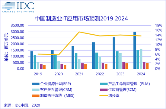 在最新发布的《中国制造业IT应用市场预测与分析,2020-2024》报告中,IDC预测,2024年中国制造业IT市场相关投资规模将达到258.2亿美元,其中IT应用(IT application)的市场规模将达到103.9亿美元,2019-2024年复合增长率为10.2%。