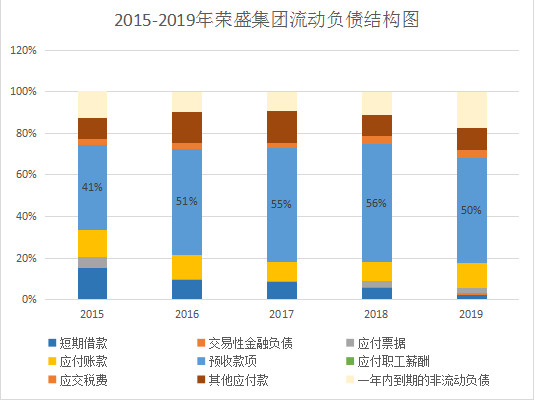 从历史5年的荣盛集团的流动负债结构图上可以看出,荣盛发展的一年内到期的非流动负债在逐年增加,短期债务压力上升。
