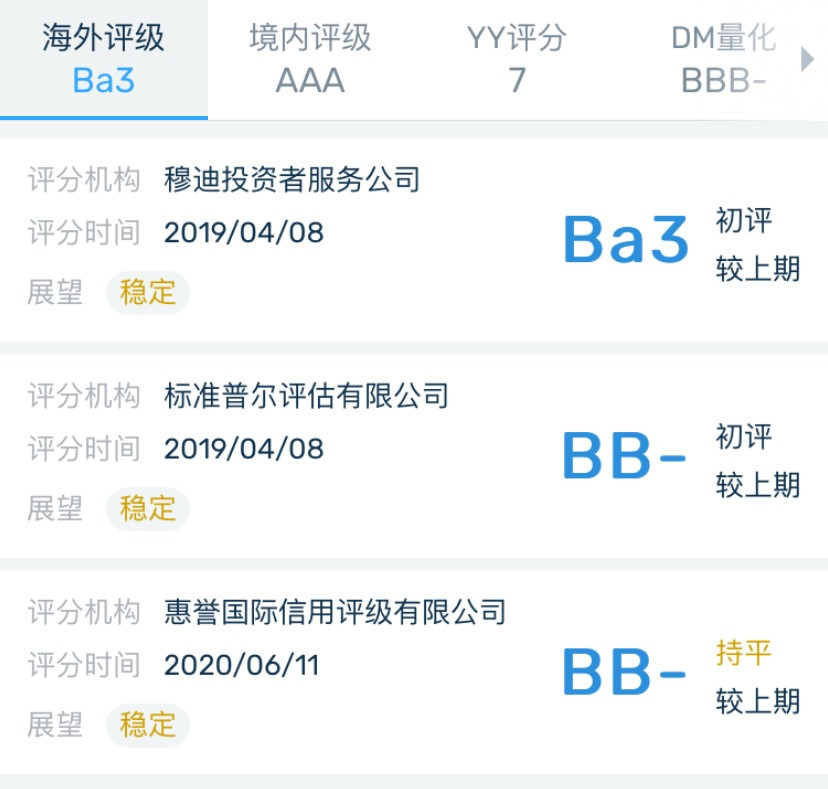 目前,三大信用评级机构标准普尔、惠誉国际、穆迪分别给予荣盛发展“BB-”、“BB-”、“Ba3”评级,对荣盛发展的实力和发展前景表示认可。