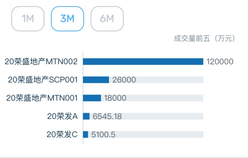 近三个月来,荣盛发展的在岸债券成交量排行榜如下图所示,排名第一的是“20荣盛发展MTN002”,成交量为12亿。