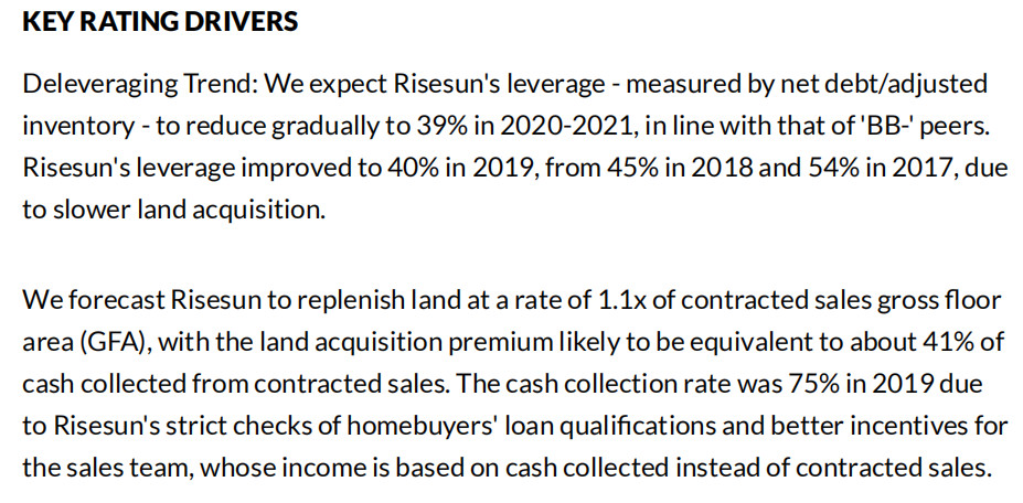 惠誉认为,预计到2020-2021年,荣盛的杠杆率(以净债务/调整后的存货衡量)将逐渐下降至39%,与BB-同行的杠杆率一致。由于土地收购速度放缓,荣盛的杠杆率从2018年的45%和2017年的54%降低到2019年的40%。