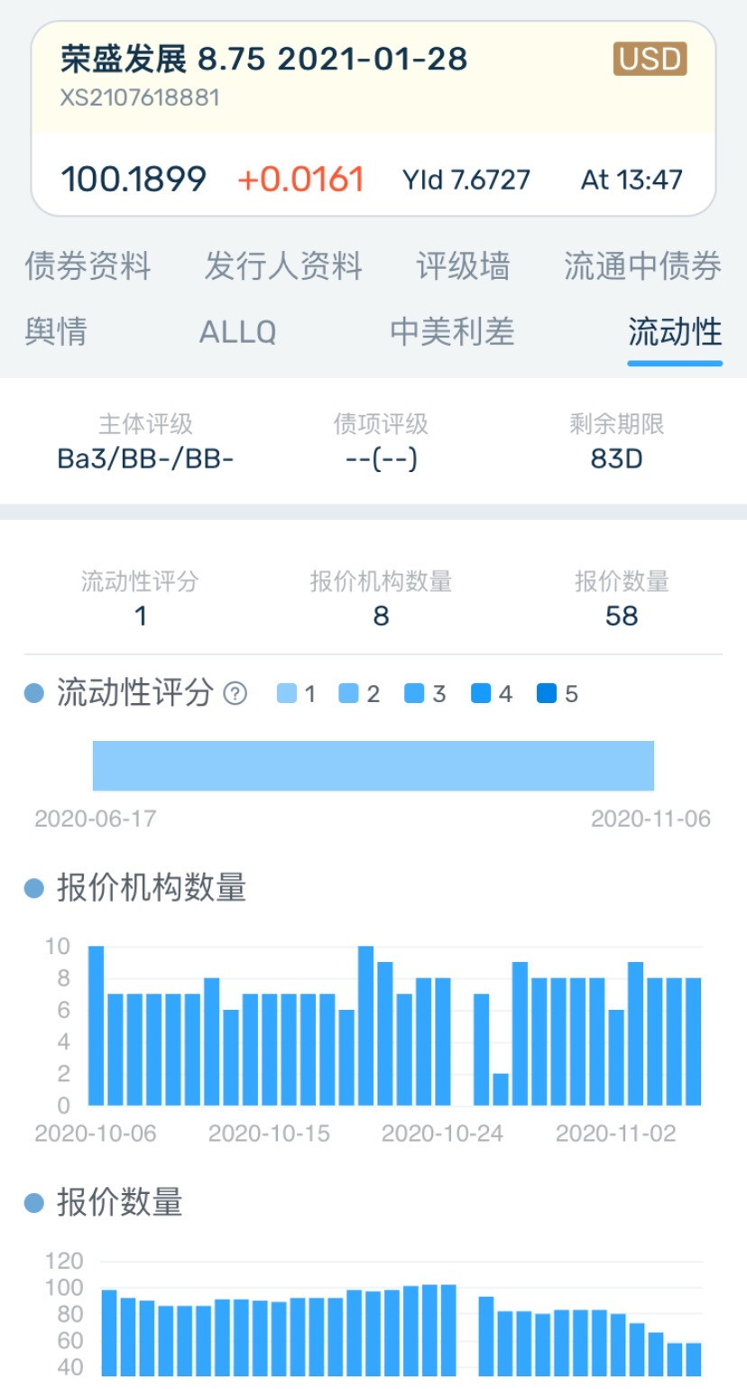 在美元债行情中,DM有一项重要的指标来判断其成交活跃性,此指标为流动性指标。流动性指标得分从1至5,1分代表流动性最好,5分代表流动性最困难。通过DM查债通可以查到具体的美元债的流动情况。雷猴查到荣盛的三只美元债流动性评分均为1分,流动性良好。其中一只“荣盛发展8.75 2021-02-28”报价数量为58,报价机构数量为8。