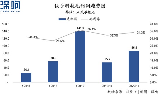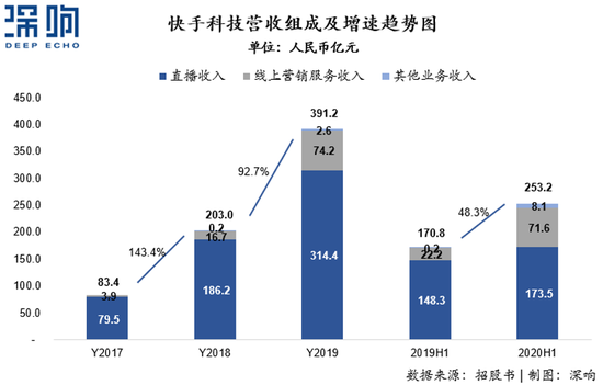 招股书披露,自2017年开始到2020年上半年,快手直播收入分别为79.5亿元、186.2亿元、314.4亿元和173.5亿元——这部分营收始终处于高速增长的轨道中,过去三年,同比增速平均超过100%,今年上半年相较去年同期增速也接近50%,在移动互联网红利趋于消失的背景下,取得如此成绩殊为不易。