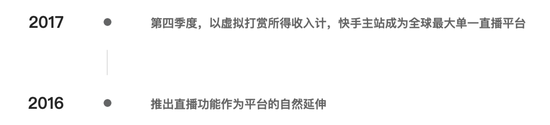 根据快手官网披露的信息,在推出直播业务不到两年的2017年四季度,以虚拟打赏所得收入计,快手已成为全球最大单一直播平台,这一成绩延续至今,目前,快手仍是以虚拟礼物打赏流水及直播平均月付费用户计的全球最大直播平台。