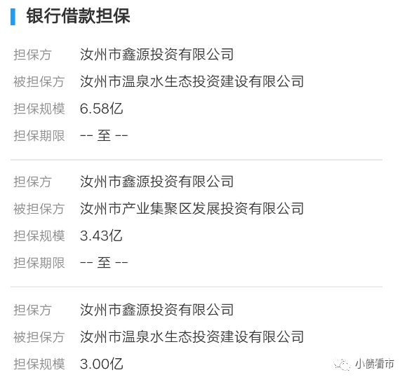 截至今年6月末,鑫源投资对外担保金额合计24.99亿元,占其净资产的11.3%,担保对象主要包括汝州温投、汝州交投等国有企业,均没有反担保措施。