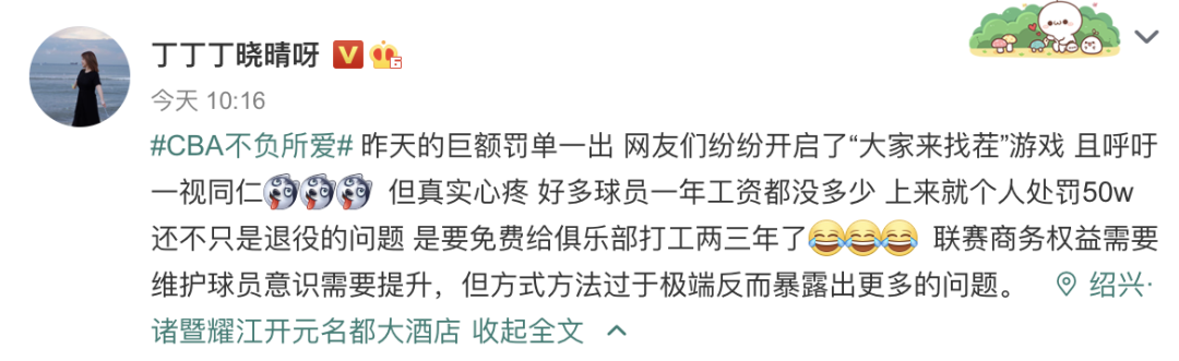 图片来源:@朱彦硕知名体育博主@丁丁丁晓晴呀表示,“昨天的巨额罚单一出,网友们纷纷开启了‘大家来找茬’游戏,且呼吁一视同仁。但好多球员一年工资都没多少,上来就个人处罚50万,还不只是退役的问题,是要免费给俱乐部打工两三年了。联赛商务权益需要维护球员意识需要提升,但方式方法过于极端反而暴露出更多的问题。”