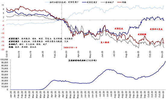 3)配置方向上,顺周期是短期主要方向,这于我们在年度展望中基于库存周期和通胀周期发现的历史规律一致。具体而言,美股市场上,疫情受损较多的线下服务和消费、复工进展缓慢经营性杠杆高、以及强周期和金融是三个可能的依次受益的递进关系,这与今年以来的板块轮动变化规律一致。