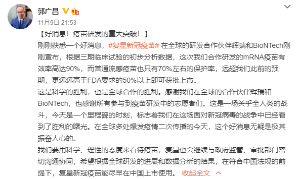 11月9日晚间,在辉瑞宣布疫苗利好消息后,复星集团董事长郭广昌通过微博发布消息称,复星是辉瑞的合作研发伙伴。