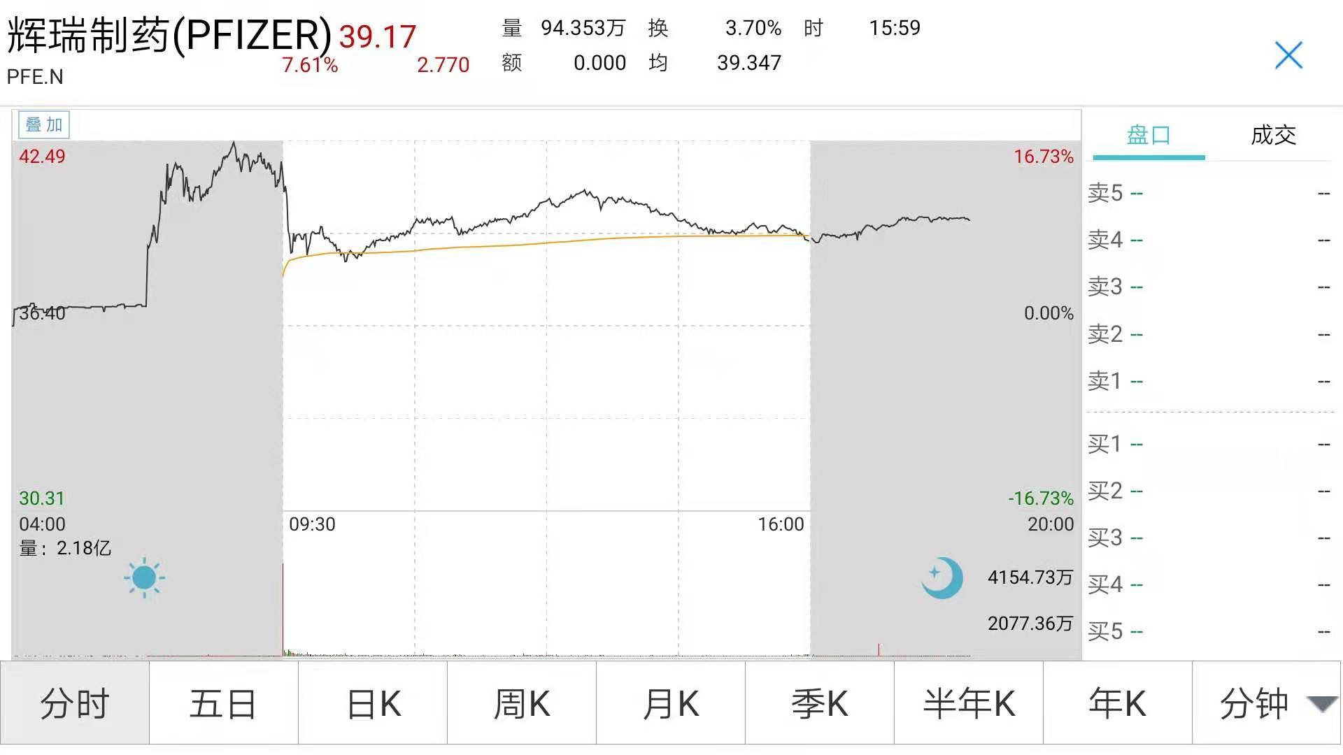 消息发布后,辉瑞制药大幅高开,盘中一度涨超12%,最高时报41.95美元/股,创下2019年7月以来的新高,尽管尾盘涨幅有所回落,但全天仍收涨7.61%,