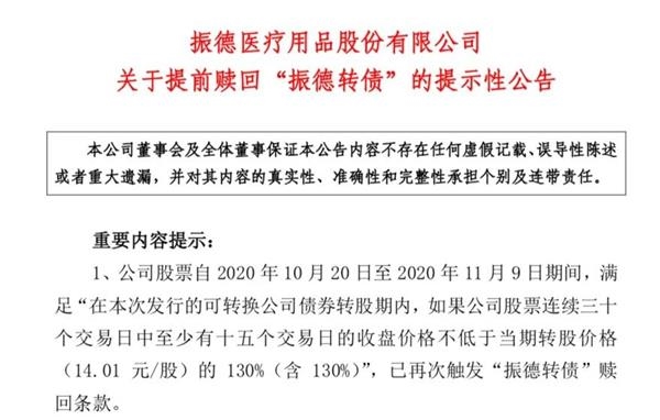 振德医疗表示,公司股票自2020年10月20日至2020年11月9日期间,满足“在本次发行的可转换公司债券转股期内,如果公司股票连续三十个交易日中至少有十五个交易日的收盘价格不低于当期转股价格(14.01元/股)的130%(含130%)”,已再次触发振德转债赎回条款。