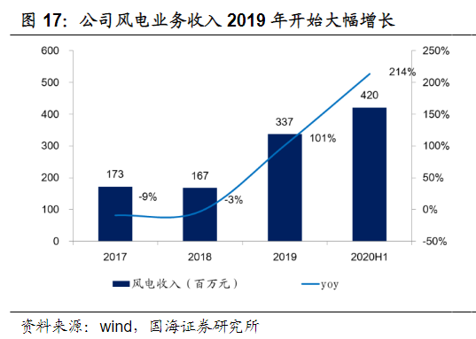公司风电收入自2019年开始大幅增长,相关产能同比增加50%,预计2020年,产能还将进一步释放。