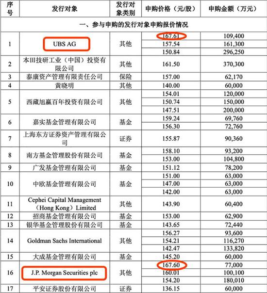 典型如宁德时代。在其定增过程中,UBS AG、JP Morgan合计认购25.6亿元,占总配售额13%。高瓴资本认购100亿元,占总额约51%。其中,UBS AG报出了全场最高价167.61元,JP摩根的最高报价为167.60元。