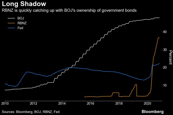值得注意的是,在今年仅仅7个月的时间里,新西兰联储对该国未偿名义政府债券的持有量从6%飙升至37%,而日本央行花了三年多时间才达到这一水平,而其起点是11%,也高于新西兰。
