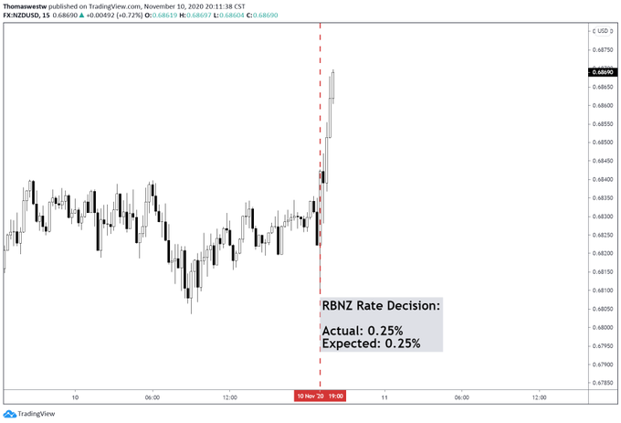 周三(11月11日)亚市盘中,新西兰联储公布11月利率决议,宣布将基准利率维持在0.25%不变,符合市场预期。新西兰联储表示,将继续实施规模高达1000亿美元的大规模资产购买(LSAP)计划,如有必要将准备提供额外的支持。在利率决议公布后,纽元兑美元大幅走高,现已刷新逾一年半高位0.6885。