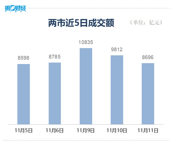 11月11日,A股三大股指震荡下行,两市成交额近8700亿元。截至收盘,沪指跌0.53%,报收3342点;深成指跌1.95%,报收13720点;创业板指跌3.31%,报收2681点。盘面上,钛白粉、白酒、水泥、煤炭、钢铁等板块涨幅居前,半导体芯片、汽车整车、航运等跌幅居前。