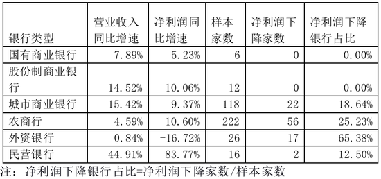 不过,民营银行内部也有所分化。北京中关村银行、上海华瑞银行的净利润出现下滑,降幅分别为44.20%、17.95%。而江苏苏宁银行净利润则大增超过20倍,辽宁振兴银行、重庆富民银行等7家银行也均增长1倍以上。
