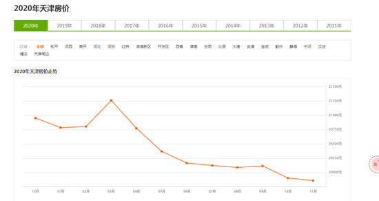 2020年3月至11月,天津房价均价呈下降趋势(安居客数据)。